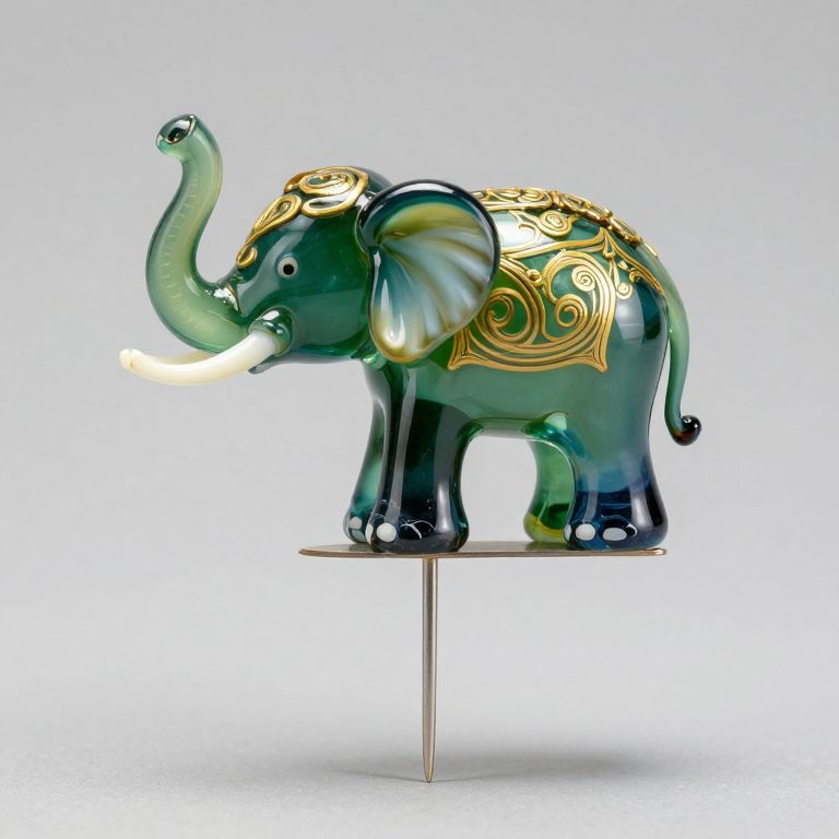 Vividly colored glass elephant, crafted with intricate details and a gradient of green, teal, and gold, gracefully balances on a slender needle, showcasing its artful design against a neutral backdrop.