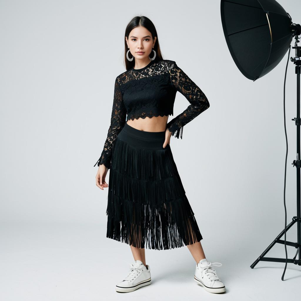 Woman, contemporary chic, lace long-sleeve crop top in black, fringe hem skirt, silver hoop earrings, white sneakers, minimalist studio background.