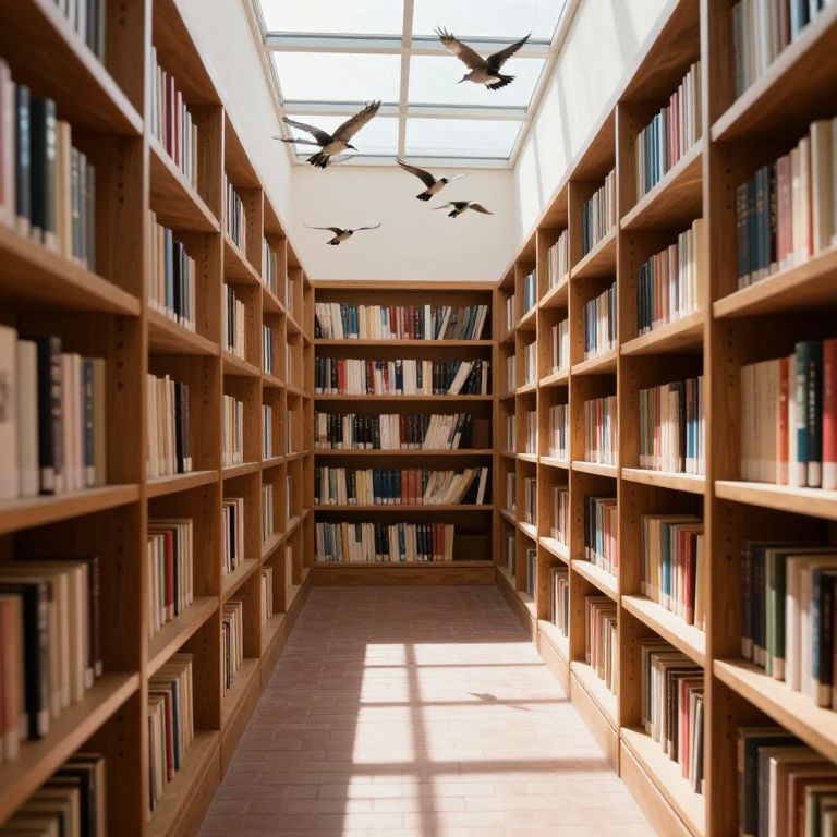 Sunlit Library Aisle with Birds