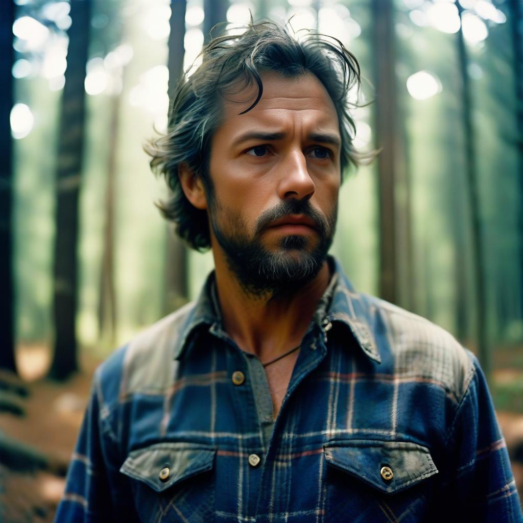 Close-up photograph of a rugged man, wearing a flannel shirt with the top buttons undone, standing in a forest, confident and disheveled, cinematic film still, Kodak Portra, sassy and trashy vibe.