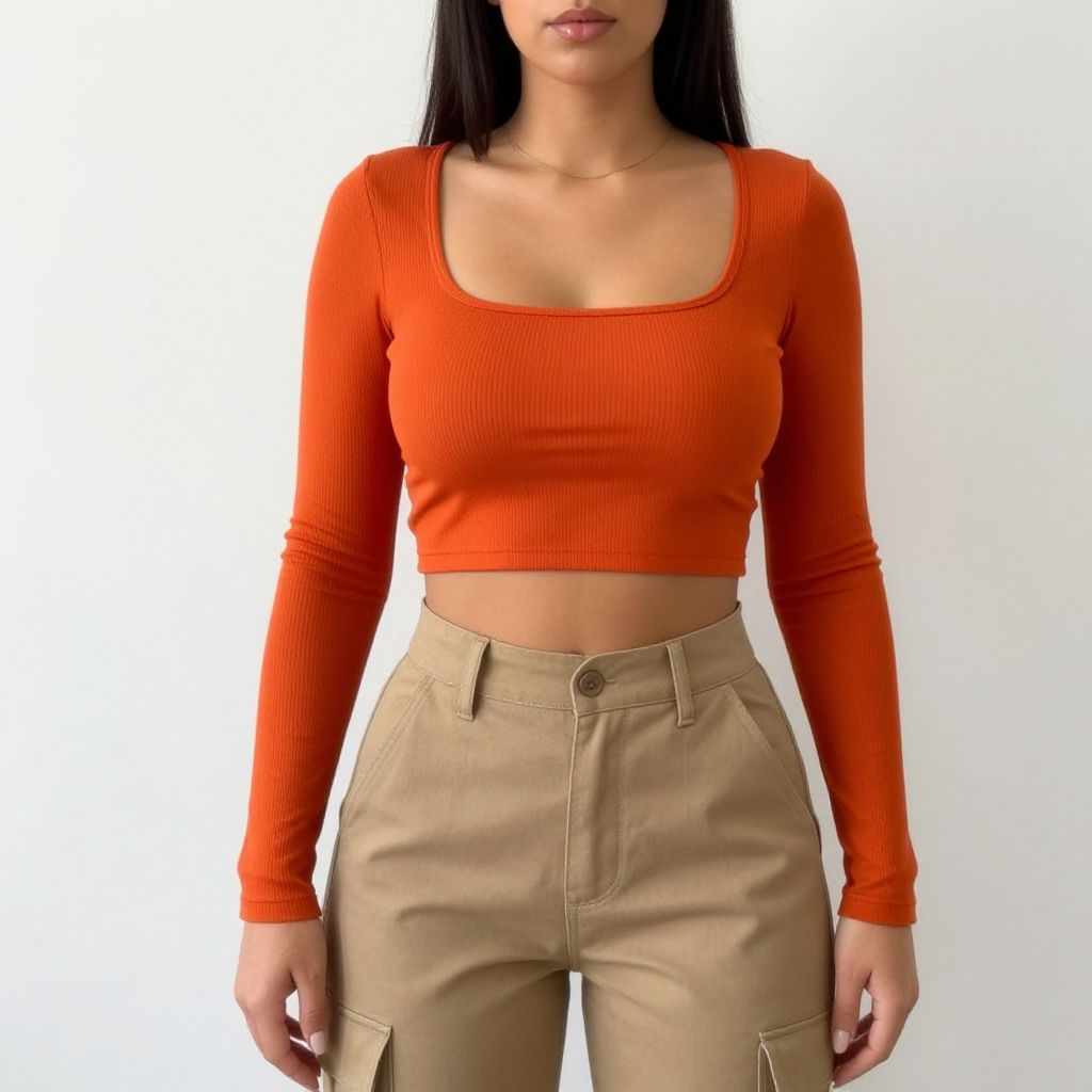 Photograph of a young woman from the waist up, wearing a long-sleeve, ribbed, orange crop top with a square neckline, revealing a hint of her midriff. She pairs the top with high-waisted, beige cargo pants that have two small pockets on each side. She has long, straight black hair and a light skin tone. The background is plain white, making the bright orange top stand out. The image is sharply focused, highlighting the textures of the ribbed fabric and the smooth, slightly shiny material of the cargo pants. Her face is partially visible with a neutral expression.