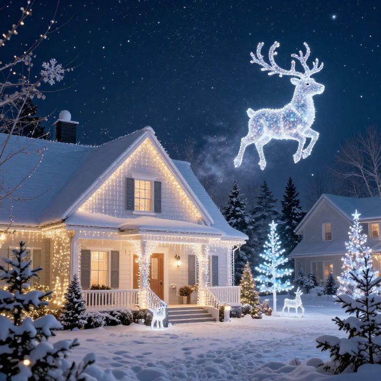 A magical winter wonderland emerges as a suburban home transforms into a radiant spectacle, adorned with cascading lights that defy gravity, glowing trees that shimmer like living crystals, and a luminous reindeer that seems to float ethereally amidst the festive glow.