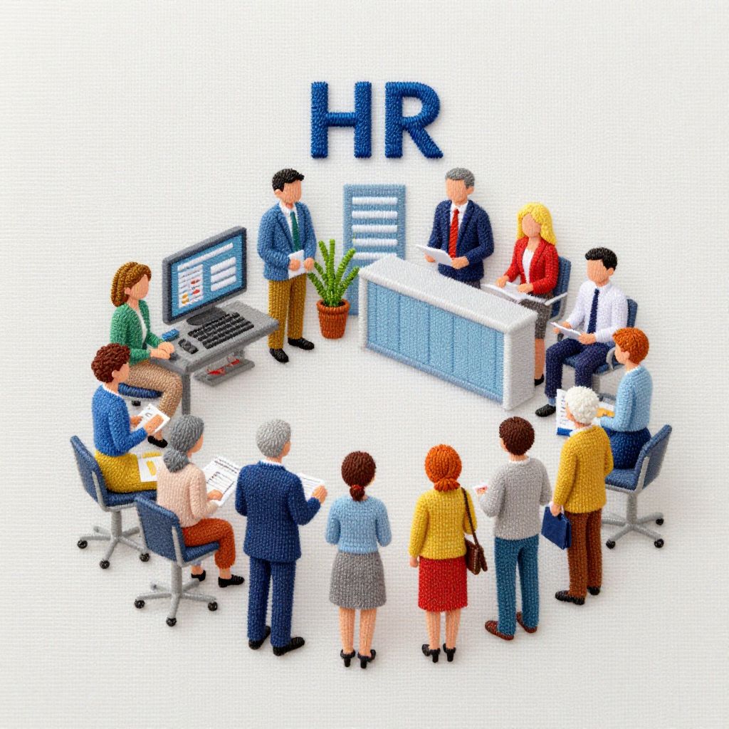 Isometric illustration of a diverse business meeting, featuring nine professionals in colorful business attire, around a desk with HR text above.