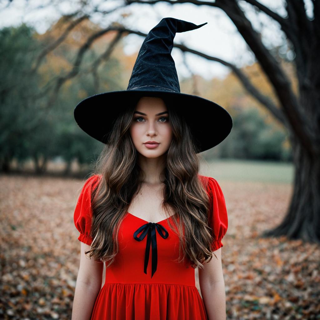 Young Woman in Witch Costume with Black Hat