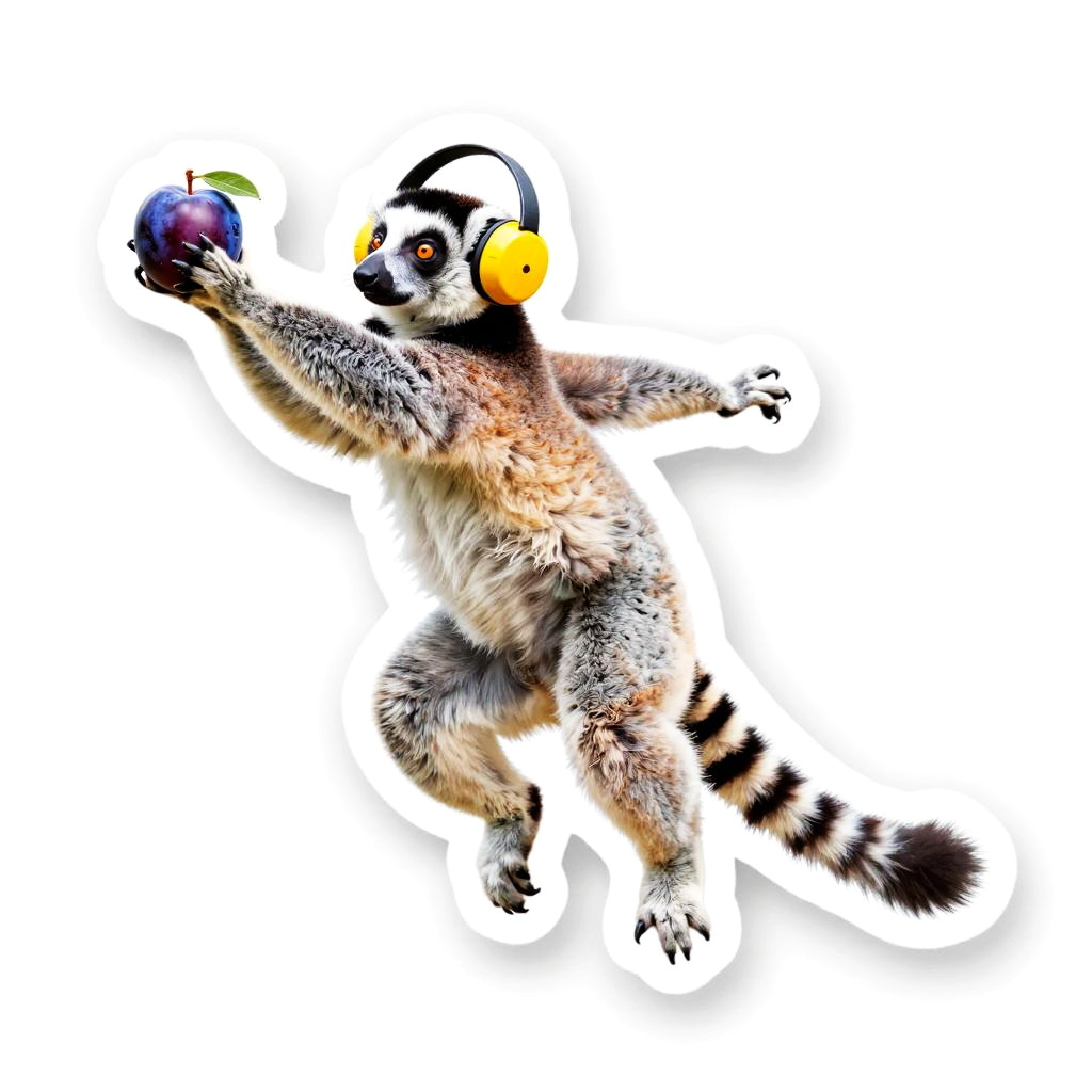 Die cut sticker of a lemur leaping to catch a plum wearing earmuffs