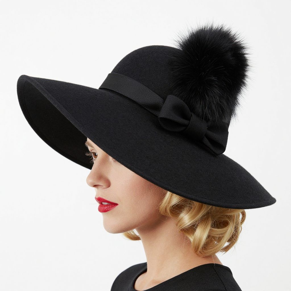 Elegant black wool hat featuring a wide brim, a luxurious rex rabbit fur pompon, and a decorative bow accent, worn by a woman with blonde curls and bold red lipstick against a crisp white background.