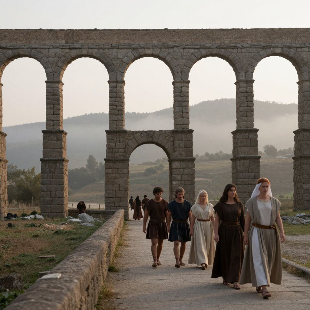 A realistic scene of a Roman-style aqueduct with a narrow stone archway, showing a group of villagers in traditional Roman-style clothing—men in short tunics and women in layered robes—walking along the stone path beneath the structure on a misty early morning in a rural Italian valley.