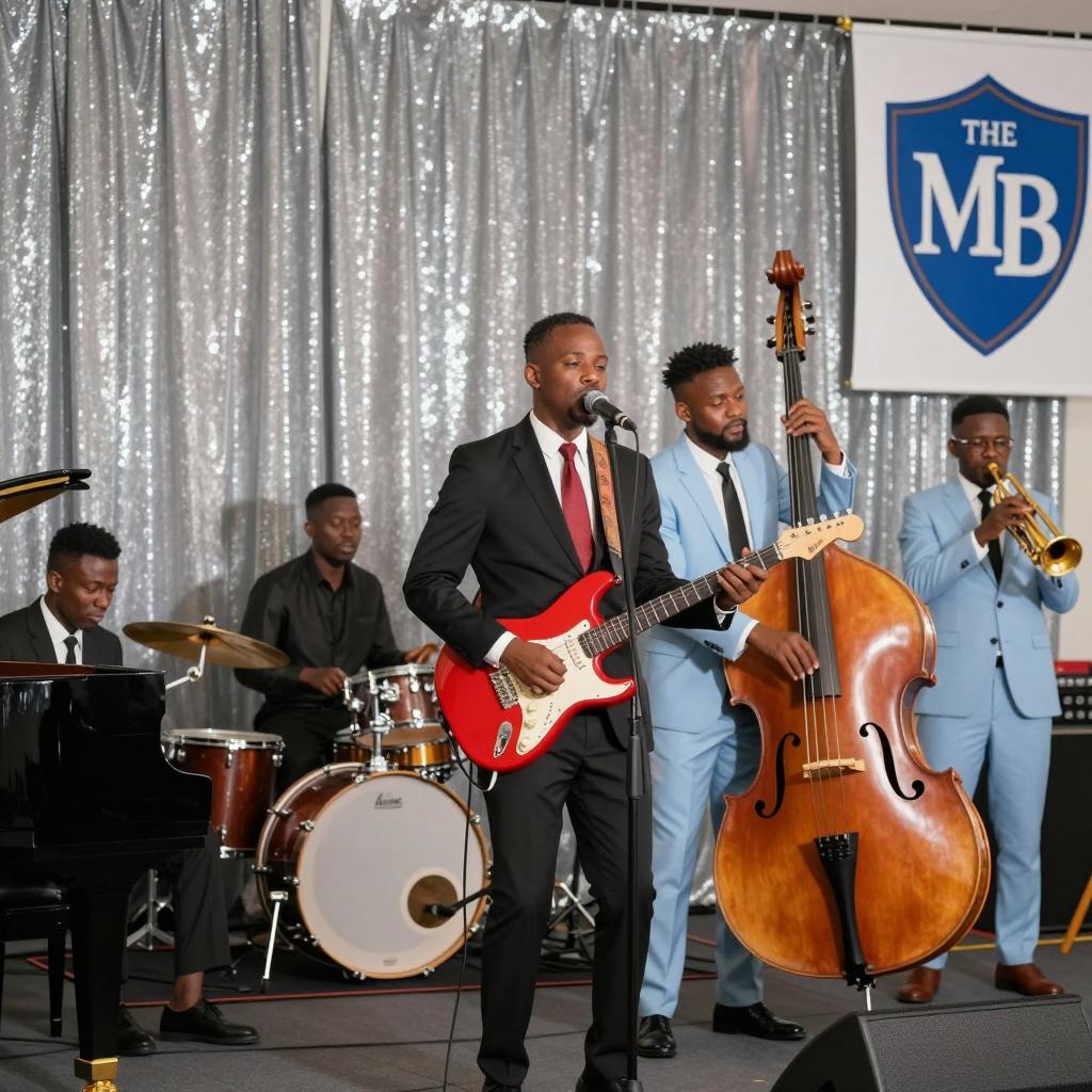 Live musical performance. Five African-American men on stage. Lead singer in black suit, white shirt, red tie, holding red electric guitar, singing into microphone. Bassist in light blue suit, holding white double bass, singing. Drummer in background playing drum set. Trumpet player in light blue suit to the right. Piano player seated to the left. Shimmering silver curtain backdrop. "Encountering The Saints" banner. Blue "MB" shield on stage right.