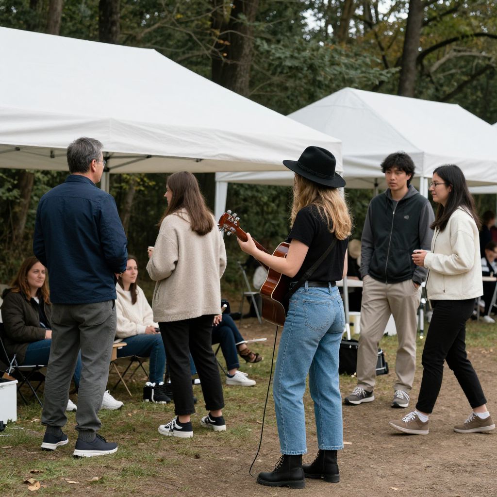 Festive attendees gather under white tents in a forested area, with a woman in a black hat and denim jeans strumming a guitar while others converse and stroll around her.