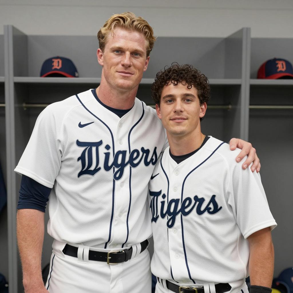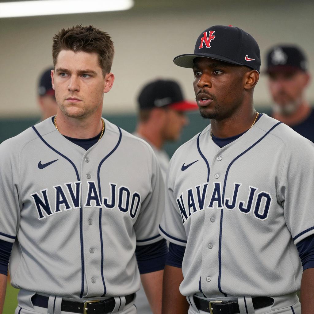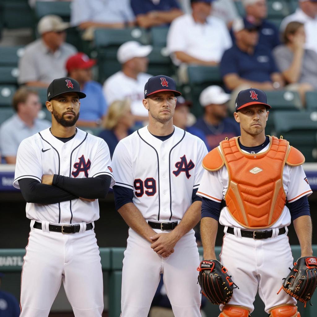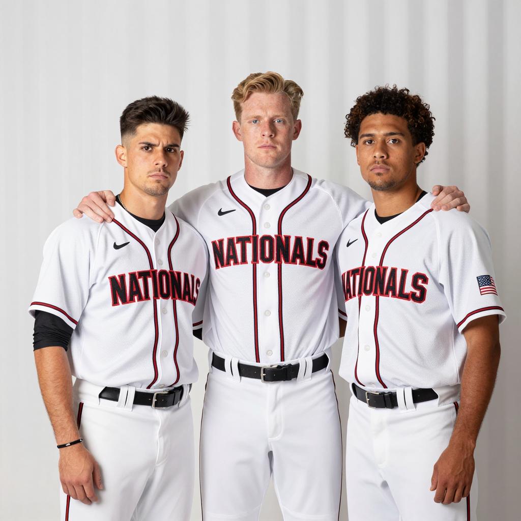 Photograph of three men in white baseball uniforms with red and black trim, standing against a white, vertically-striped background. The man in the center has blond hair, arms around the shoulders of the other two. The man on the left has dark hair, intense expression, black wristband. The man on the right has curly hair, neutral expression, red and white patch on sleeve. All wear white jerseys with "NATIONALS" across the chest.