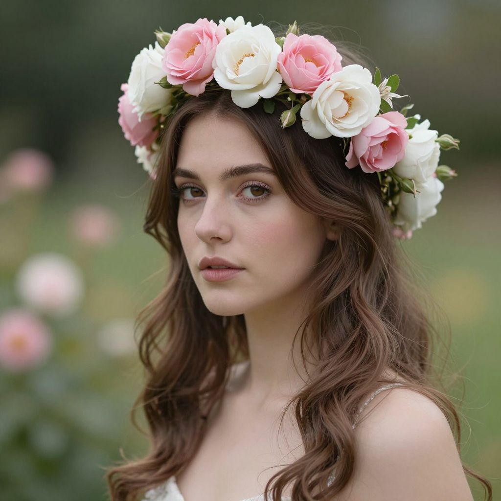 Elegantly adorned with a vibrant floral crown of pink and white roses, a woman gazes serenely against a soft-focus garden backdrop, exuding a timeless blend of natural beauty and artistic fantasy.