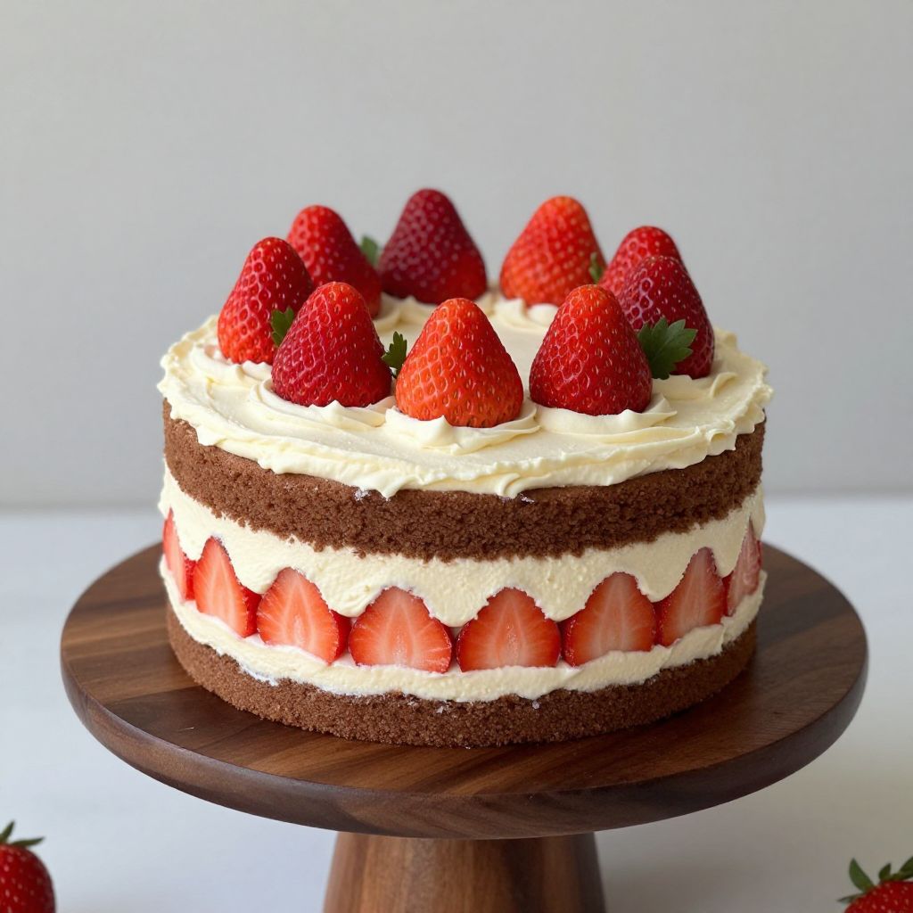 Delicious two-tiered strawberry cake with layers of creamy frosting and chocolate sponge, elegantly displayed on a dark wooden stand, topped with vibrant red strawberries and green leaves.