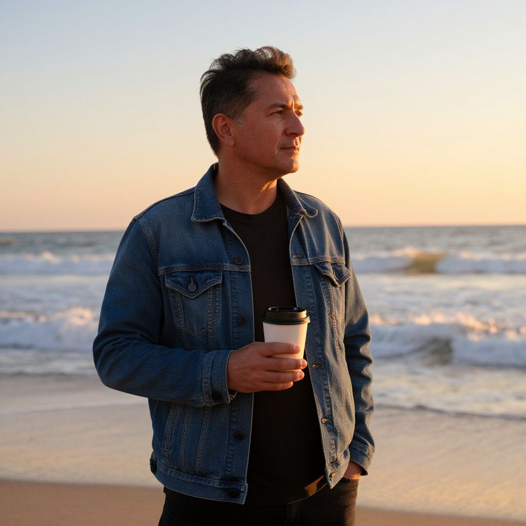 A thoughtful man in a blue short-sleeve shirt sits by the seaside during a vibrant sunset, with soft waves and rocky cliffs in the background. The warm golden light highlights his relaxed yet contemplative expression, creating a serene and picturesque coastal scene.