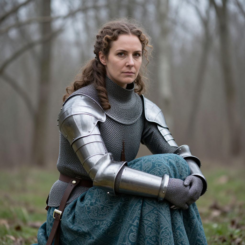 Photograph of a Caucasian woman with curly brown hair, dressed in medieval-style armor. She wears a silver breastplate and gauntlets over a chainmail shirt, and a teal, patterned skirt. She sits in a forest with bare trees in the background, looking slightly to the right with a serious expression. Her armor is reflective, contrasting with the muted, overcast forest setting. The texture of her chainmail is intricate, and the skirt has a paisley-like design. The overall mood is somber and regal.
