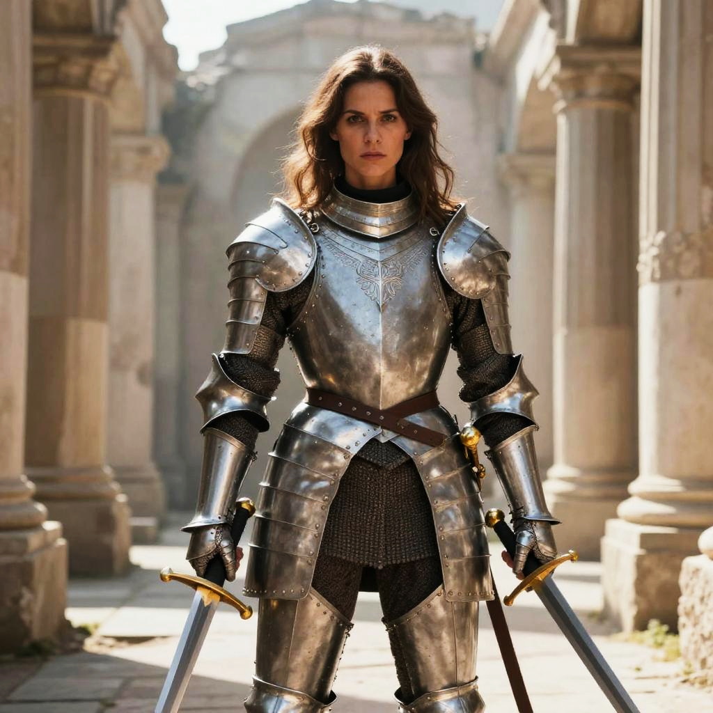Photograph of a curly-haired woman in medieval silver armor and teal patterned skirt, sitting in a misty, forested background.