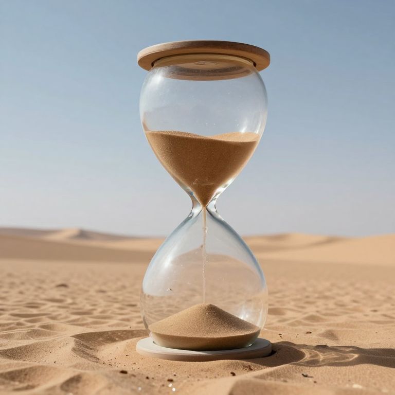 Photograph of a clear glass hourglass with sand trickling, set in a sunlit, sandy desert landscape under a clear blue sky.