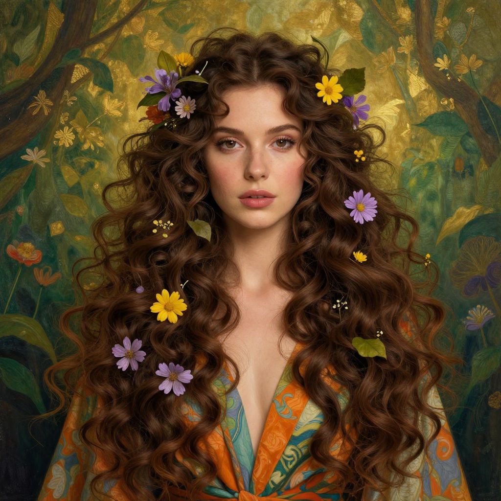 The image depicts a woman with long, curly hair adorned with vibrant flowers and leaves, creating a harmonious blend of nature and elegance. Her hair, a rich dark brown, cascades down, intertwined with delicate purple and yellow flowers that add a touch of whimsy and romance. The background is a lush tapestry of green and gold hues, suggesting an enchanted forest or a garden, further emphasizing the natural theme. The woman's attire is a flowing, patterned garment that complements the floral elements, with shades of orange, blue, and green. The overall composition is balanced, with the woman's face centrally positioned, drawing the viewer's attention to her serene expression. The interplay of colors, textures, and shapes creates a sense of depth and dimension, making the image appear almost three-dimensional. The intricate details in the flowers and leaves, along with the soft, glowing light, contribute to a dreamlike quality, evoking a sense of wonder and beauty.