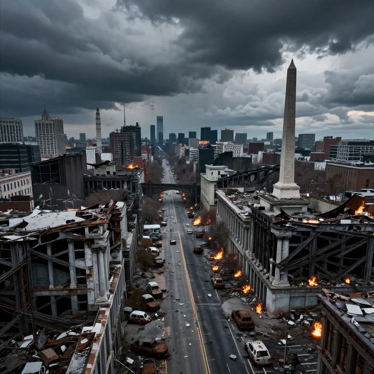 DC ruins viewed from above, vast cityscape in decay with collapsed bridges and crumbling monuments, dark clouds looming overhead, scattered fires illuminating the rubble below, desolate streets with rusted vehicles and remnants of a lost civilization, dramatic and moody composition.