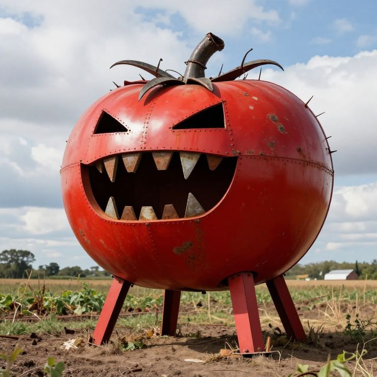 In a fallow pasture on a farm, a giant tomato sculpture stands as a testament to the farmer/artist's creativity. Crafted from scrap metal and old farm equipment, this tomato is a striking piece of art, its vibrant red hue contrasting sharply with the muted tones of the surrounding landscape. The tomato's surface is textured with the roughness of rust and wear, adding a sense of age and history to the sculpture. Its large, open mouth reveals rows of sharp teeth, giving it an almost menacing appearance. The tomato's body is supported by sturdy, red legs that resemble the sturdy stalks of a real tomato plant. The sculpture's head is adorned with metal leaves and thorns, further enhancing its organic yet industrial look. The sky above is a mix of blue and white clouds, providing a serene backdrop to this unique and imaginative creation.