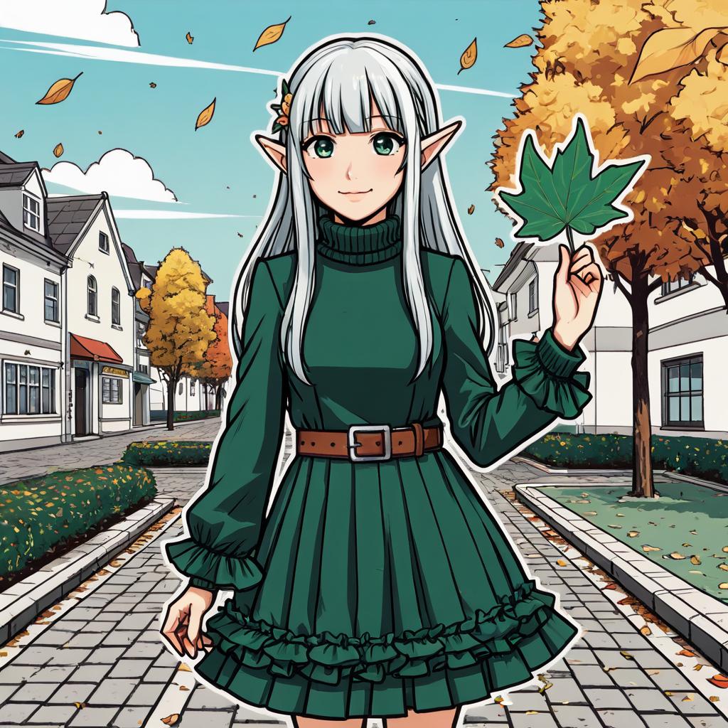 Ink sketch, (sketch:1.3), letterboxed, (border:1.5), 1girl, elf, solo, green eyes, white hair, long hair, floating hair, blunt bangs, turtleneck, long sleeves, frilled dress, belt, pouch, upper body, expressionless, (looking away:1.2), hand up, (holding a leaf), walking, (cropped torso:1.1), (cropped background:1.1), (chibi:1.2), town, autumn leaves, blue sky, pavement, fountain, star hair ornament
