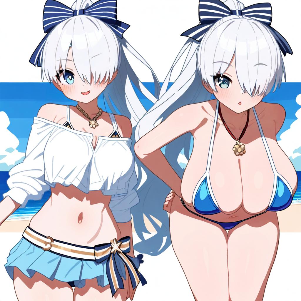 Anastasia (swimsuit archer) (fate), fate/grand order, 1girl, blue eyes, hair over one eye, very long hair, white hair, grey hair, ponytail, hair bow, large breasts, medium breasts, cleavage, thighs, navel, collarbone, blue bikini, blue skirt, bare shoulders, puffy long sleeves, necklace, beach, by artist akisora, animagine