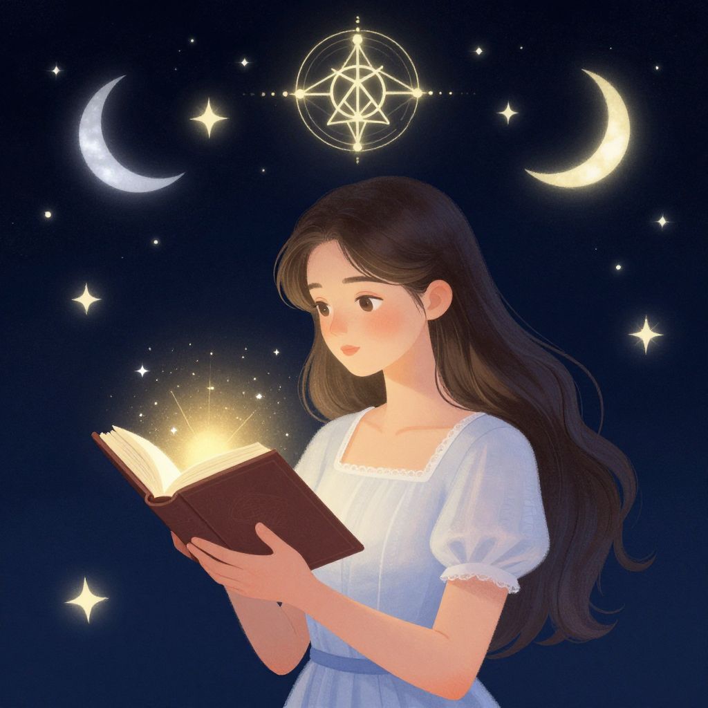 An enchanting illustration featuring a young woman holding a magical book, set against a celestial backdrop. The artwork highlights a sense of wonder, with stars, crescent moons, and a mystical symbol above her, creating an atmosphere of fantasy and exploration.