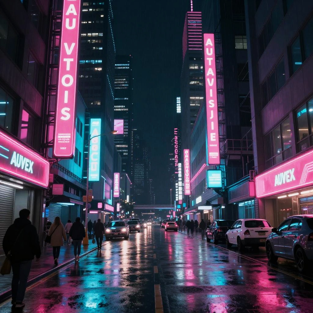 Wallpaper:auvs6acok5m=, cyberpunk cityscape at night with neon signs in electric pink and cyan, rainy streets reflecting vivid lights, detailed architecture and bustling atmosphere, cinematic style, sharp focus