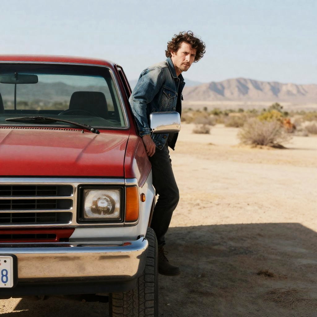 Photograph of a red and white pickup truck with a man leaning out of the driver's side window, wearing a denim jacket and dark pants. Dry, sunlit desert landscape with sparse vegetation in the background. Man has curly brown hair, intense expression. Truck has chrome bumper, rectangular grille, and visible California license plate. Sunlight casts shadows on the truck and ground.