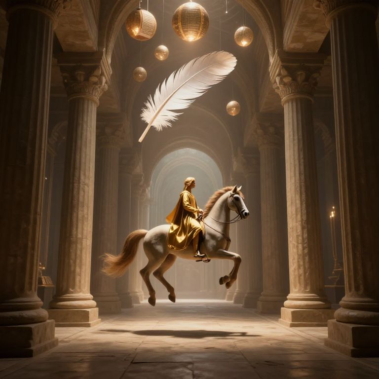 A lone figure clad in golden robes rides a levitating horse through an endless corridor lined with towering stone columns, suspended manuscript spheres glowing softly above, while a large feather floats gracefully in the air, casting an ethereal glow over the ancient, mystical passage.