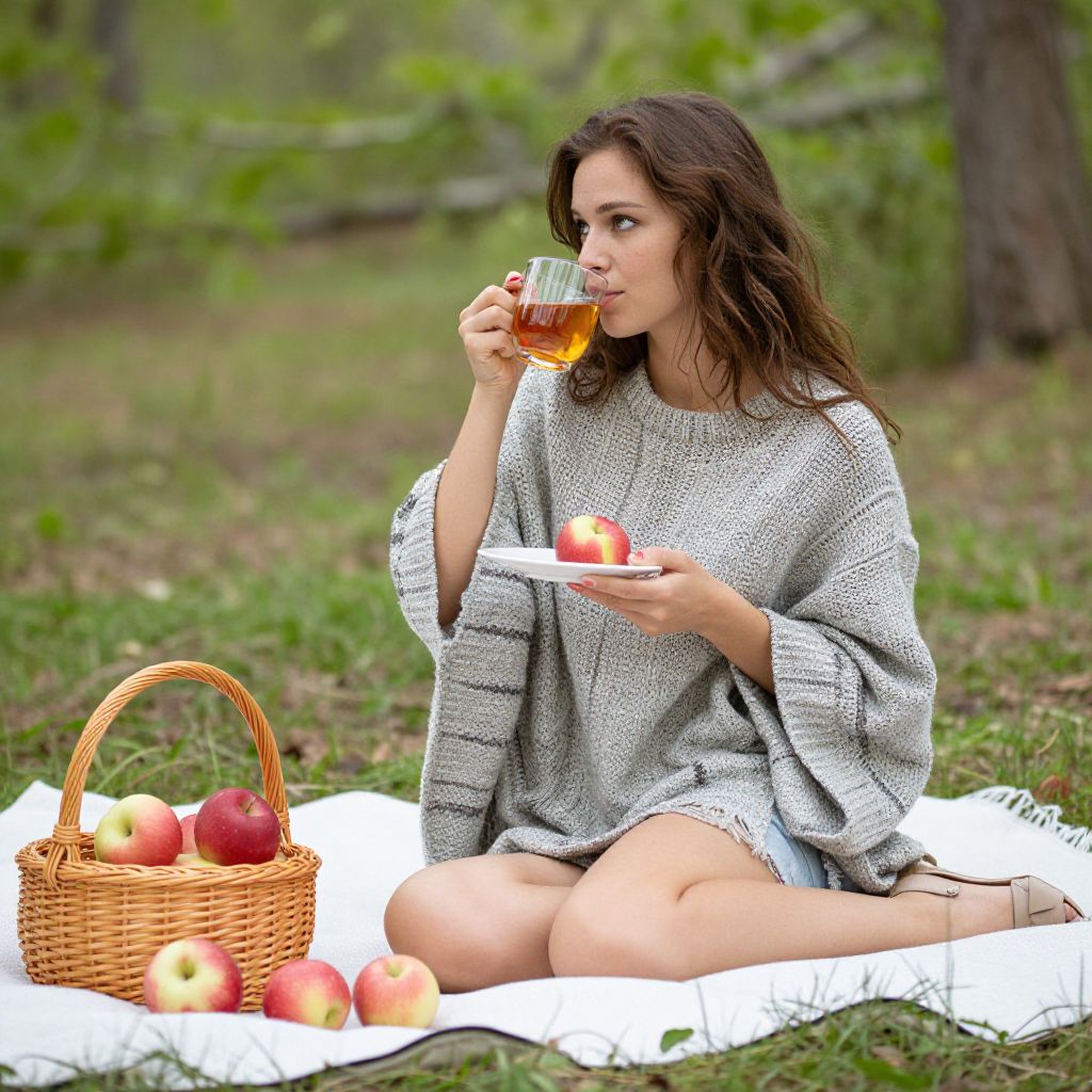 Photograph of a young woman with fair skin and wavy brown hair, sitting on a white blanket in a grassy forest. She wears a loose, beige knit sweater and black flats, holding a glass of amber liquid to her lips with her right hand, while her left hand holds a red apple. In front of her, a wicker basket filled with assorted apples rests on the blanket. The background is blurred with greenery and trees, creating a serene outdoor setting. The lighting is natural, highlighting the textures of her sweater and the apples.