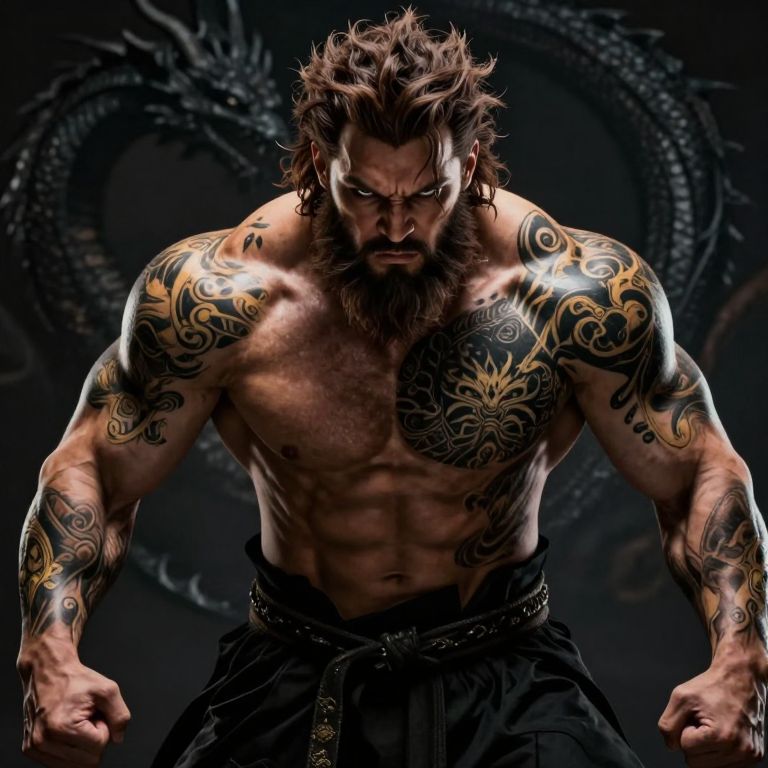 The image depicts a powerful, muscular figure with a fierce expression, exuding an aura of strength and dominance. The character is adorned in black clothing, accentuated with intricate gold and black tattoos that cover his arms and chest, adding a sense of mystique and complexity. His brown hair and beard are styled in a rugged, untamed manner, enhancing his intimidating presence. The background is dark, with subtle hints of a dragon-like figure, suggesting a connection to mythical or fantasy themes. The overall composition is dynamic, with the character positioned centrally, drawing the viewer's attention immediately. The use of light and shadow creates a dramatic effect, highlighting the contours of his muscular physique and the detailed patterns on his tattoos. The character's gaze is intense, almost as if he is ready to engage in a battle or challenge, embodying the essence of a powerful, mythical being.