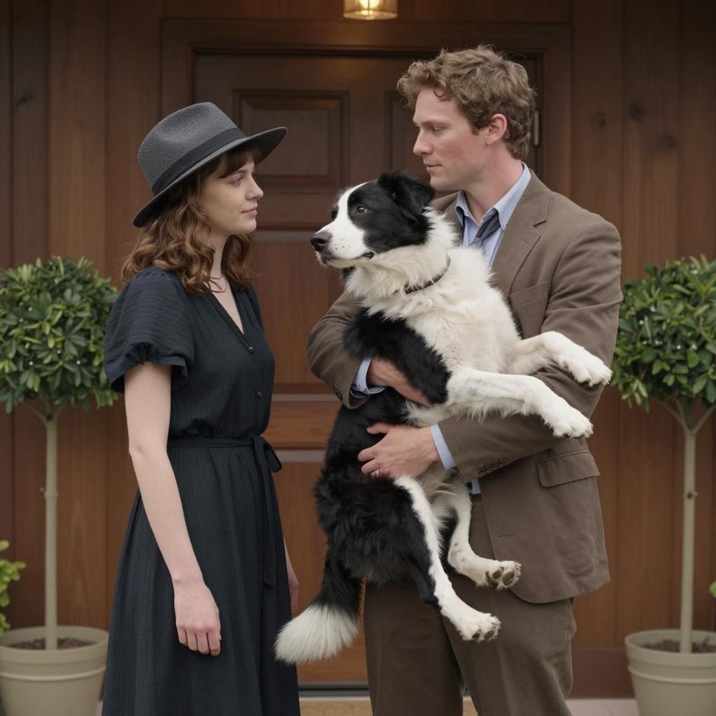 Photograph of a man and woman with a golden retriever. They stand on a rooftop at night, looking at each other. The woman has dark hair, wears a black coat. The man has blond hair, wears a black suit with a blue shirt. The golden retriever is in front of them, looking up. City skyline with lit buildings in the background. Both have slight smiles.