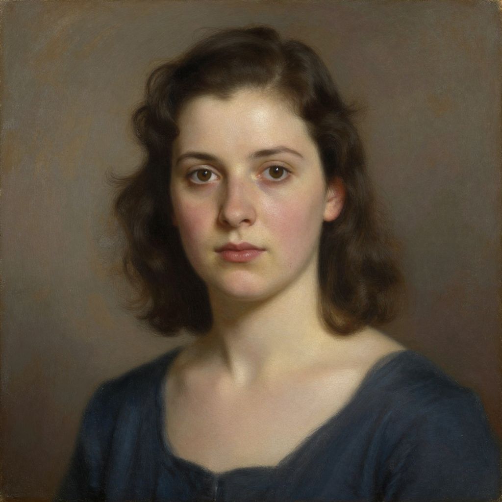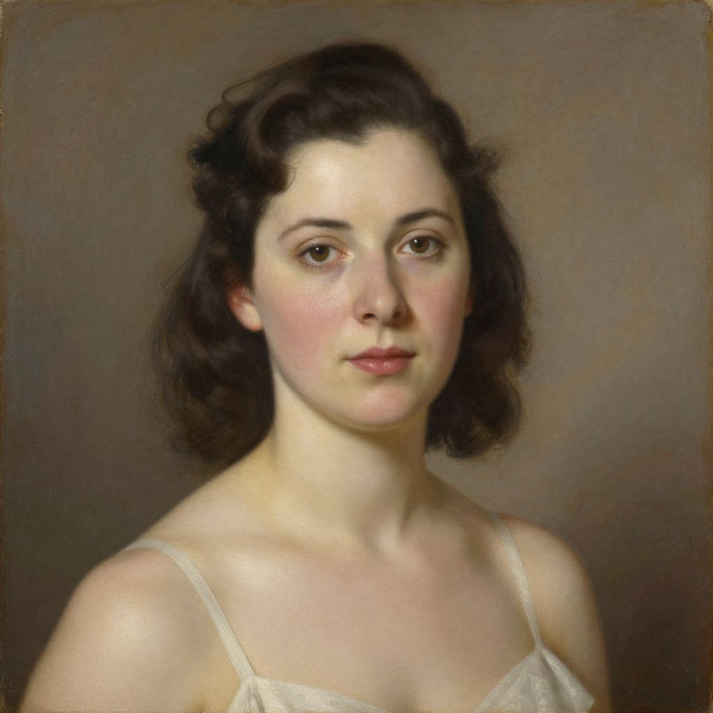 Realistic oil painting of a pale-skinned woman with dark, wavy hair, wearing a white, thin-strapped dress, against a neutral background