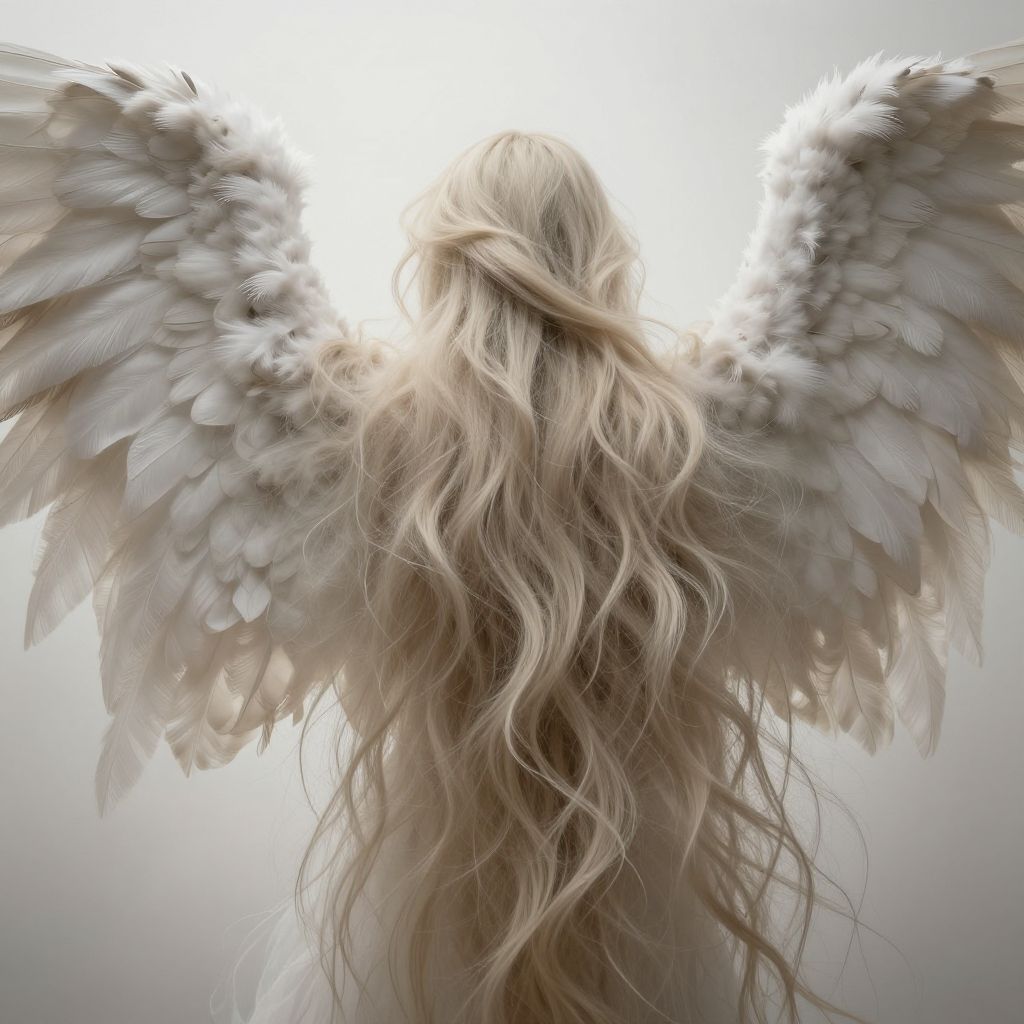 Hair on wings: a surreal depiction of large angelic wings covered in flowing strands of hair, ethereal lighting, soft texture, dreamy fantasy artwork, intricate detail