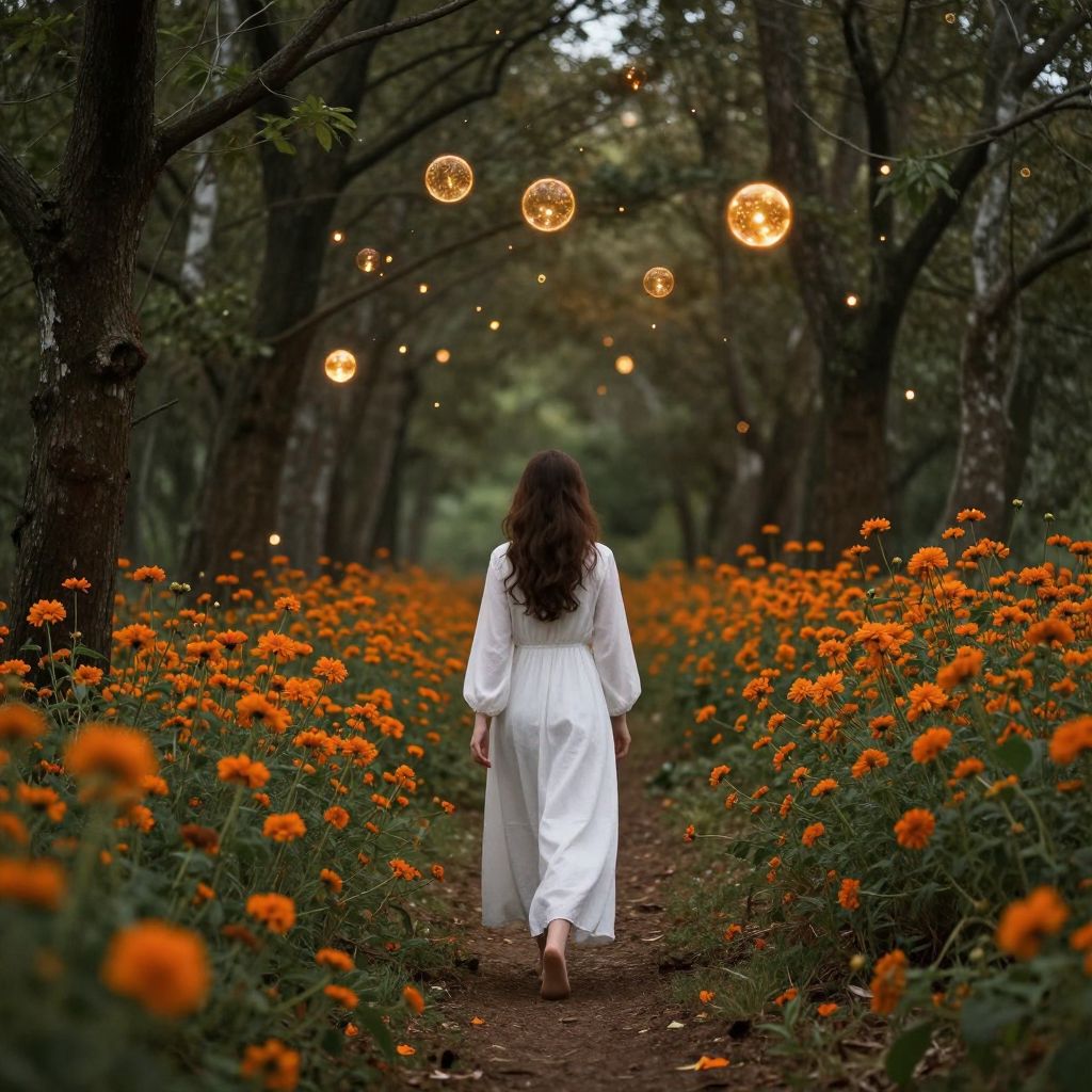 A woman in a flowing white dress walks barefoot along a forest path, surrounded by vibrant orange flowers and illuminated by floating orbs of golden light that dance among the trees, creating a serene and ethereal atmosphere.