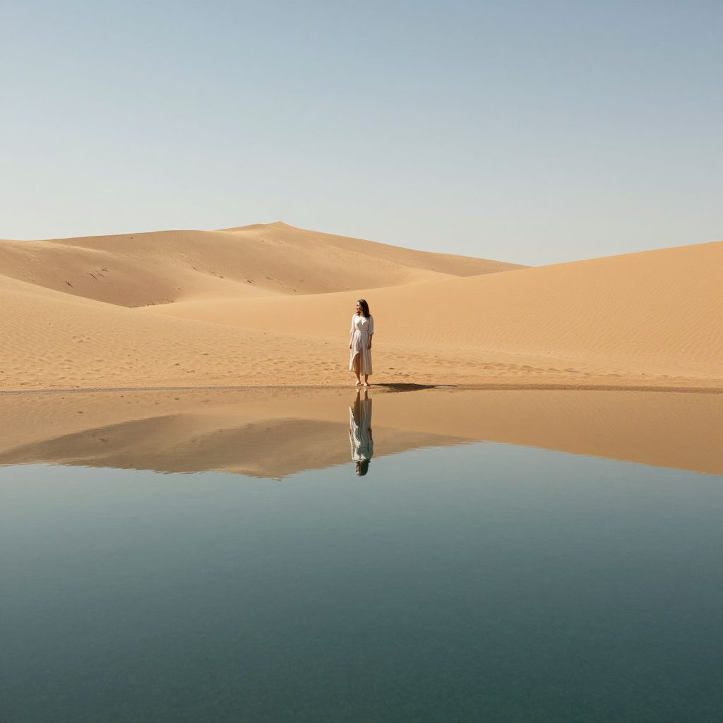 In a surreal desert landscape, a woman stands at the edge of a perfect, mirror-like pool that defies gravity, its surface seamlessly merging with the sand, creating an illusion of infinite reflection and impossible symmetry.