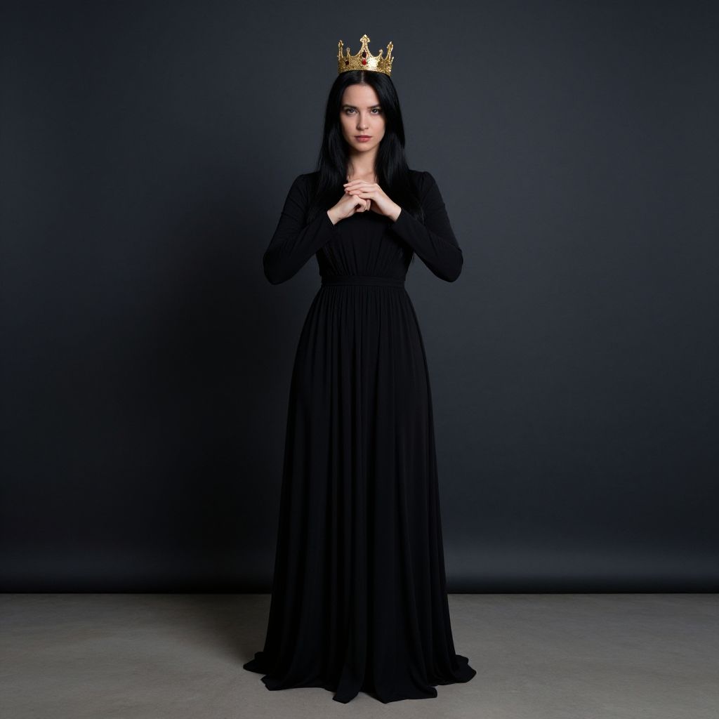 Photograph of a pale-skinned woman with long, straight black hair standing against a dark gray background. She wears a black, long-sleeved, floor-length gown and a gold crown with intricate designs. Her hands are gently clasped in front of her chest. The lighting is soft, highlighting her serious expression and the delicate texture of the gown. The dark background creates a dramatic contrast, emphasizing her regal appearance. The overall mood is mysterious and elegant.