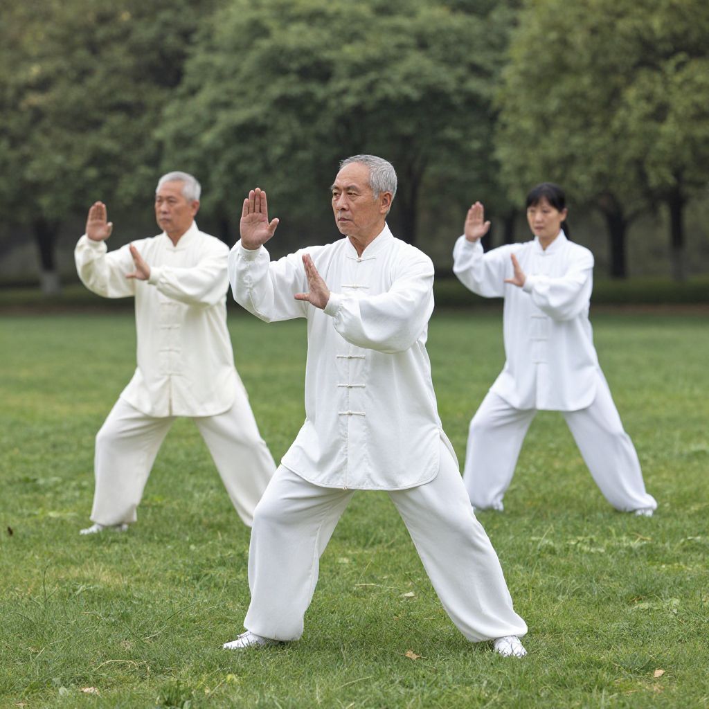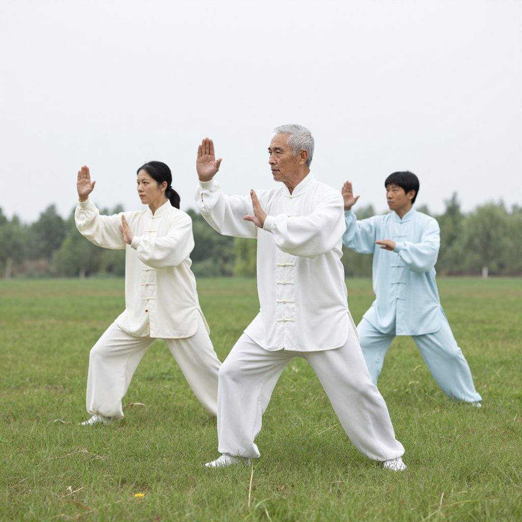 Photograph of three martial artists practicing tai chi on a grassy field. The foreground features an older man with gray hair, dressed in a white traditional martial arts uniform, mid-movement with arms raised. Behind him, two younger individuals, one with black hair and the other with short black hair, also wear white uniforms. They are slightly blurred, indicating movement. The background shows a blurred green trees line under a bright, overcast sky. The image captures the focus, balance, and coordinated movement of the practitioners.