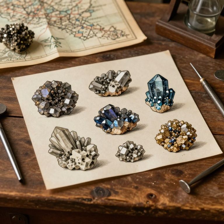 Photograph of seven intricately designed crystal clusters on a white sheet of paper, placed on a rustic wooden table. The crystals vary in color and shape, including black, blue, and clear with metallic accents. A map with colored lines and a glass jar are in the blurred background. A black pencil and a metal ruler are positioned on the table's left and right sides, respectively. The lighting is natural, highlighting the crystals' facets and textures. The overall style is artisanal and decorative.