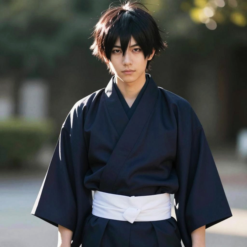 Photograph of a young man with medium-length brown hair, wearing a white shirt, holding a katana with a black hilt over his right shoulder. He has a serious expression, looking upward with slightly teary eyes. Dark background, blurred.