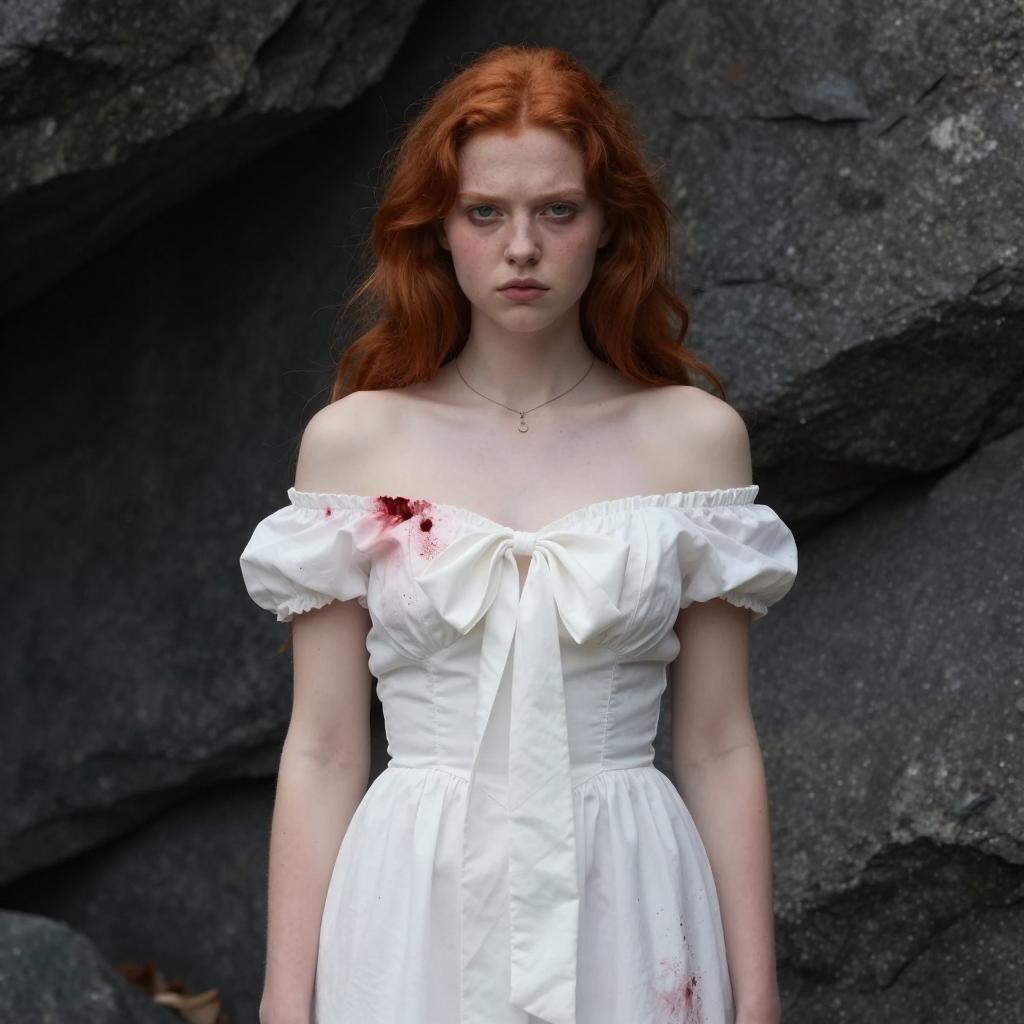 A young woman with long red hair standing against a dark, rocky background. She has fair skin and wears a white off-shoulder dress with a large bow on the right side, stained with red blood on the left shoulder. Her expression is serious and slightly defiant. She has a thin gold necklace around her neck. The background features dark, ured rock formations. She is centered in the frame, looking slightly to the right.