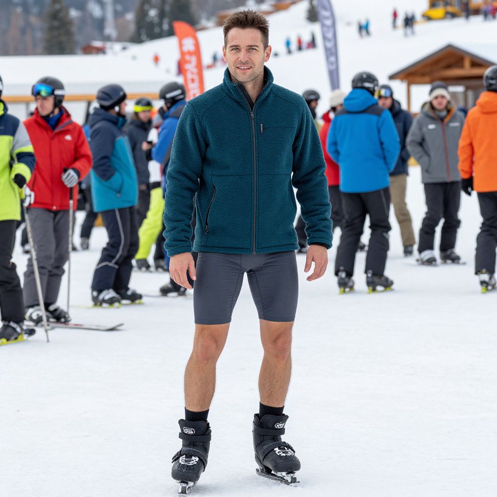 A man, dark teal zip-up jacket, fitted athletic shorts, black skate shoes, standing in a bustling après-ski scene, vibrant colors, candid shot, relaxed smile, enjoying the atmosphere. Man has masculine face and piercing eyes