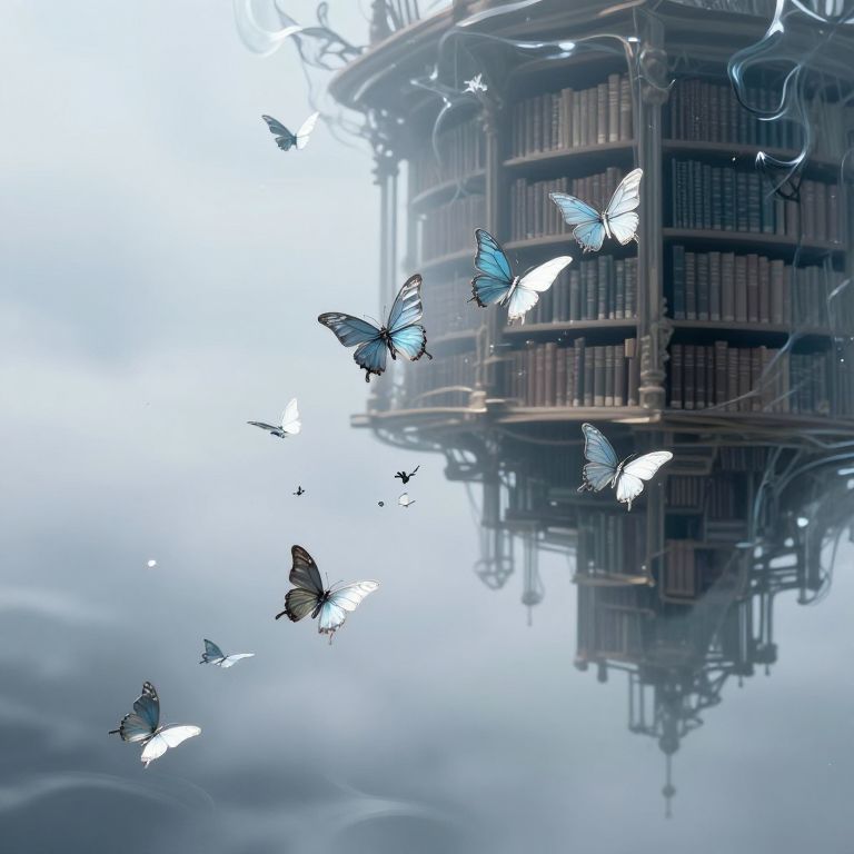 Digital art: Floating, ornate library reflected in calm water, surrounded by blue and white butterflies, with soft, ethereal lighting.