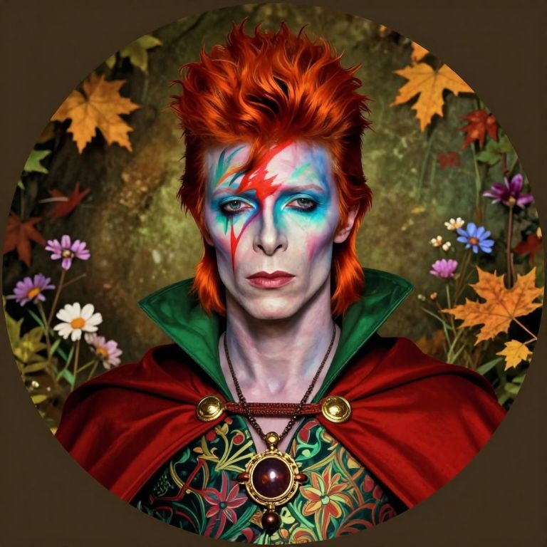 The image depicts a striking portrait of a character reminiscent of David Bowie, rendered in a fantastical, Dungeons and Dragons-inspired style. The character's face is adorned with vibrant, abstract face paint in shades of blue, green, and red, adding a mystical and otherworldly quality. His hair, a fiery red, is styled in a wild, untamed manner, complementing the dynamic and enigmatic aura of the figure. The character is dressed in a detailed, medieval-inspired outfit, featuring a red cape and a green scarf, both of which are intricately patterned with floral designs. A necklace with a large, ornate pendant hangs around his neck, further enhancing his regal and mystical appearance. The background is a lush, natural setting, filled with autumnal leaves and delicate flowers, creating a harmonious blend of earthy tones and soft, warm colors. The overall composition is circular, framing the character and emphasizing the central focus on his face and upper body. The interplay of colors, textures, and shapes creates a visually captivating and immersive scene, evoking a sense of enchantment and wonder.