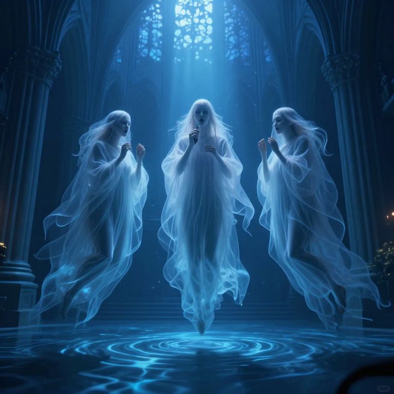 Three ethereal, blue-lit ghostly figures in flowing white robes float above a glowing blue pool in a dimly lit, gothic cathedral.