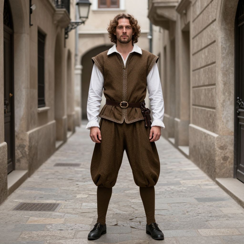 Photograph of a Caucasian man with curly brown hair and a beard, standing in a narrow, stone-paved alleyway. He wears a white shirt with puffy sleeves, a brown, sleeveless, buttoned vest with a belt, and brown puffed pants. Black leather boots complete his outfit. The background shows beige stone buildings with black iron window grates and a lantern on the left. The image has a medieval, fantasy aesthetic, with the man's attire suggesting a historical or Renaissance-inspired character. The alleyway is slightly blurred, drawing focus to the man in the foreground.