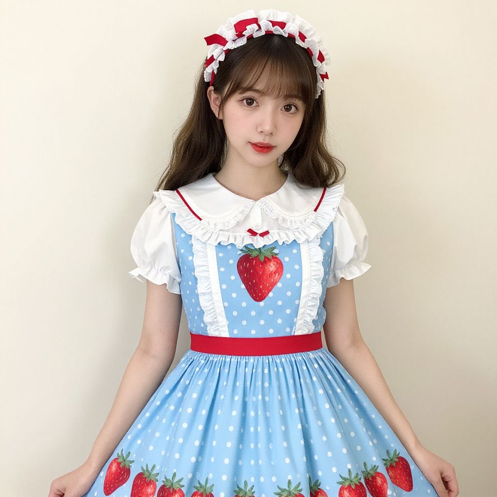 A young woman poses wearing a charming blue dress adorned with white polka dots and vibrant strawberry prints, complemented by a white ruffled collar and puffed sleeves. She accessorizes with a matching ruffled headband featuring red and white, creating a playful and vintage-inspired look.