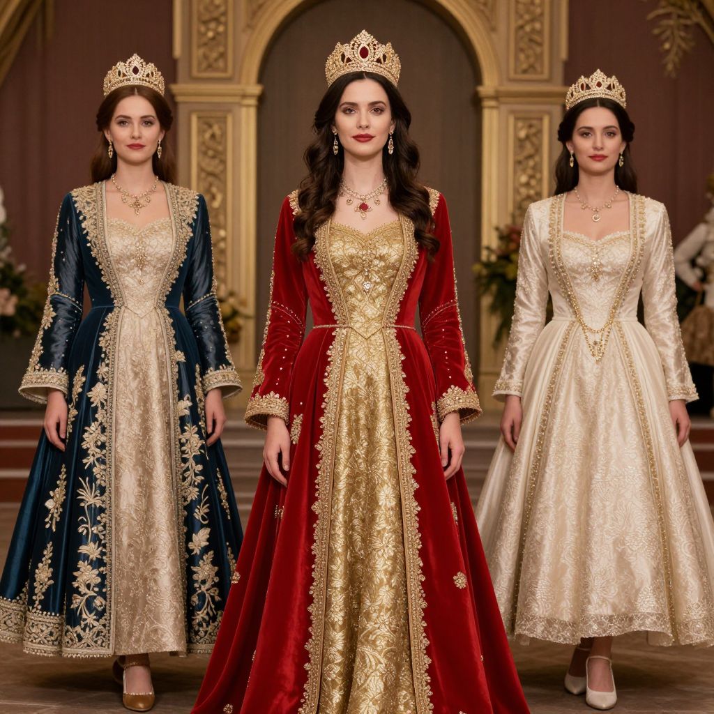 Photograph of three elegant women in ornate royal gowns: blue, red, and white, each wearing gold tiaras, standing in a luxurious