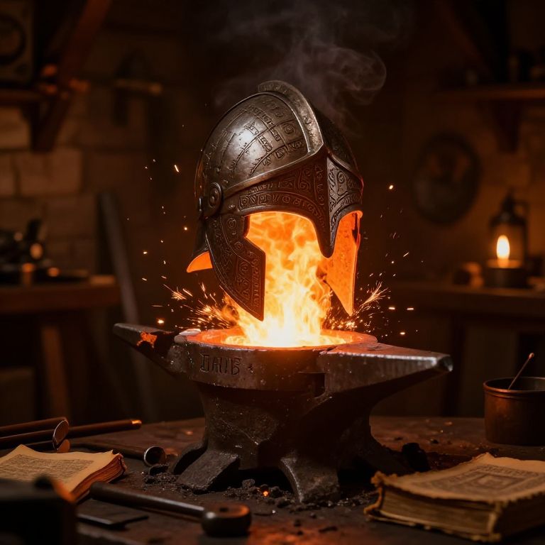 Helm's mythical forge room, glowing with molten metal and sparks, master blacksmith crafting an ornate helm with intricate runes, warm amber light illuminating the workshop, rustic tools and ancient tomes scattered around, magical realism style.