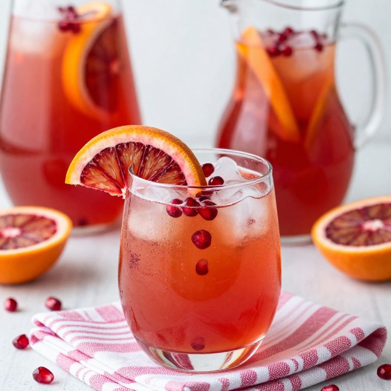 Refreshing Blood Orange Sangria with vibrant pomegranate seeds and ice cubes served in a glass garnished with a slice of blood orange, resting on a pink-and-white striped napkin, accompanied by a pitcher filled with the same sangria in the background.